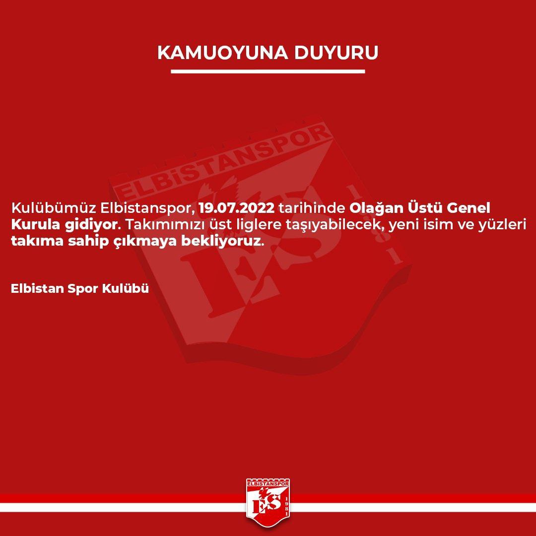 19 Temmuz’da yapılacak kongre ile ilgili olarak kulüp yönetiminden yapılan açıklamada, “Kulüp olarak 19 Temmuz tarihinde olağanüstü genel kurulumuzu yapacağız. Takımımızı üst liglere taşıyabilecek yeni isim ve yüzleri Elbistanspor’a sahip çıkmaya bekliyoruz” denildi.